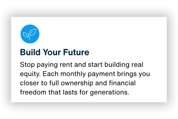 Our homes offer the same easy layouts, friendly neighborhoods, and peace of mind you value, but with a clear and realistic path to ownership. Move in now, enjoy your space, and start building equity toward your future.